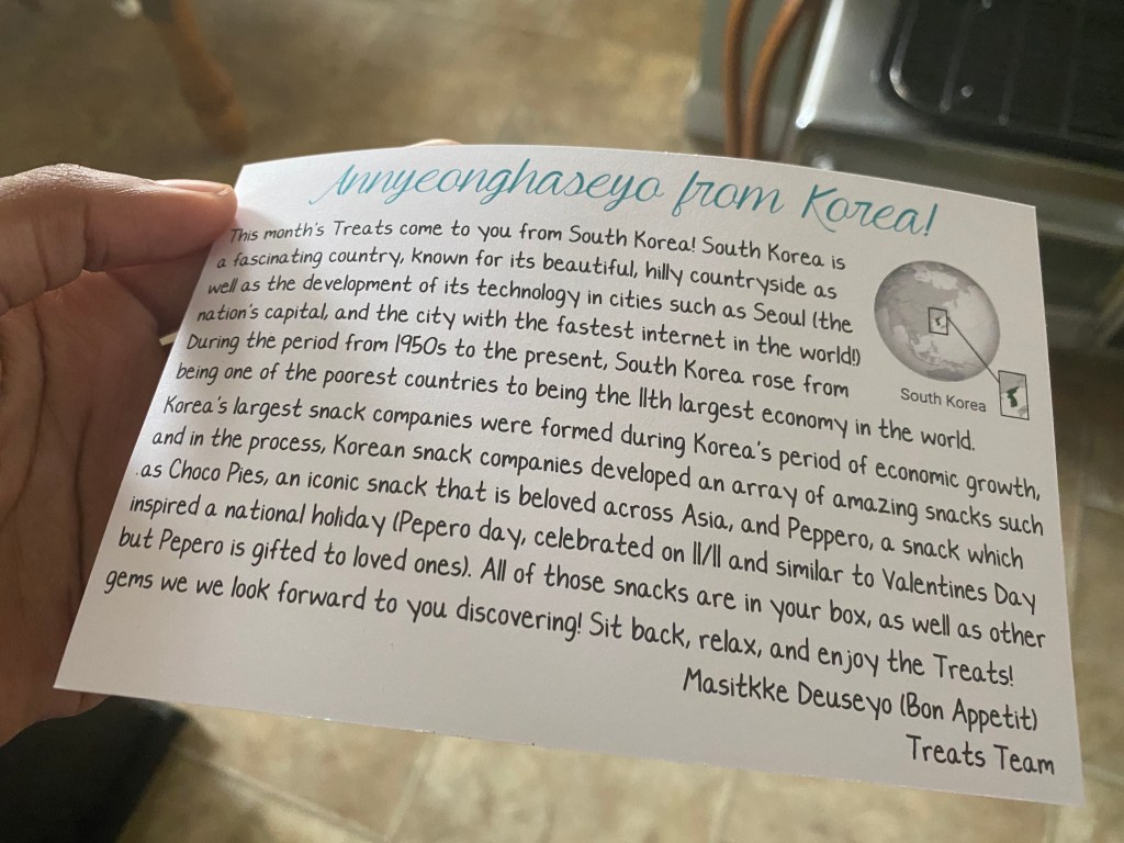 First Impressions: When I saw that the box had come, I was so excited! Knowing that the concept was going to be about other countries’ snacks, I was really curious to know what country was in the box. I have always loved learning about different countries. The country of the month was one that I was interested in: South Korea. I plan on learning Korean while in college, so this is exciting for me! Read along as I give my take on each snack!