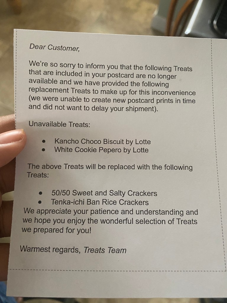 What is Treats? Treats is a subscription box that carries treats from other countries. Each month, they bring you a new box of snacks that represent a different country. It comes with a postcard, a guide of snacks, facts about the country, and a recipe on the back.