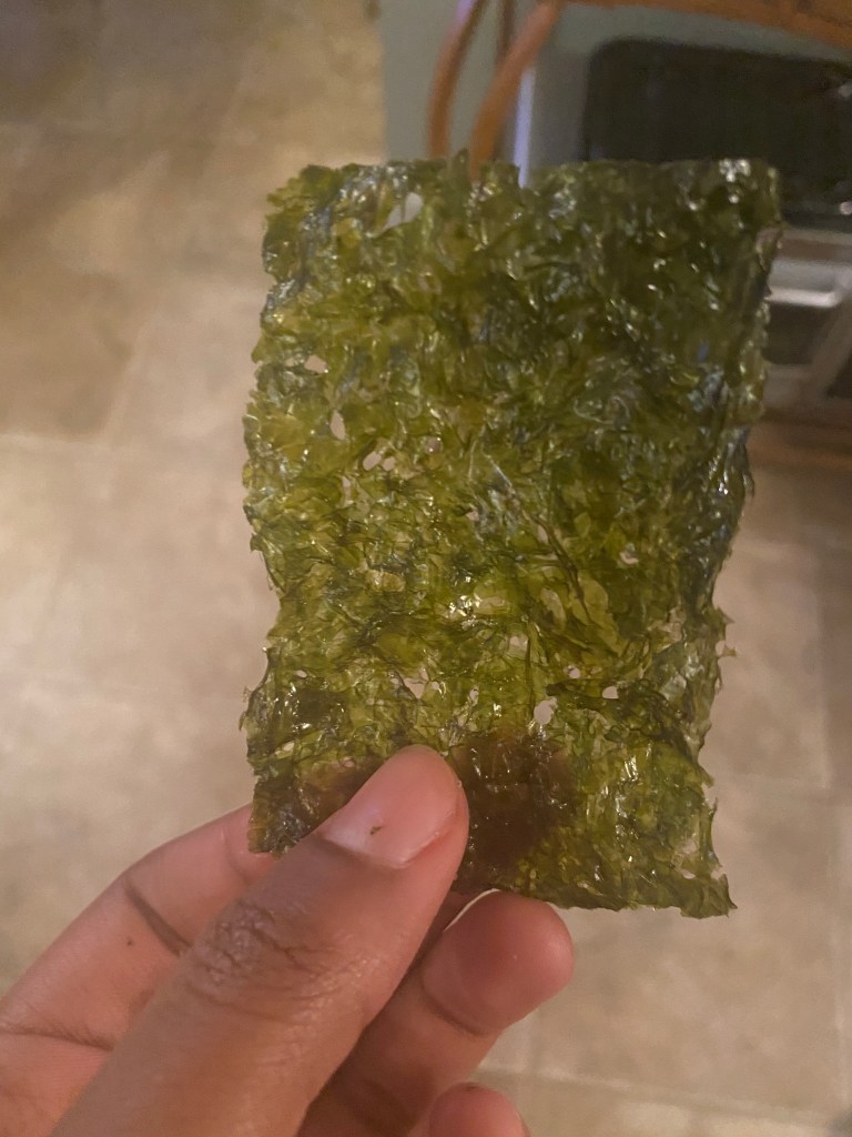 Toasted Seaweed by Samjuga Gim: I’ll admit. I’ve never really had seaweed before. But trying it for the first time, it’s… kind of weird. Even in restaurants, I would never try seaweed, because I thought it wouldn’t be that good. Having it raw basically confirms that. Although, I am aware that sushi can be made with seaweed, but that’s different. Raw seaweed gives my breath an unpleasant odor. Unless I made myself, I doubt I’d ever eat seaweed again. I don’t avidly hate it, but I don’t like it either. This snack gets a “no” from me. 2/5