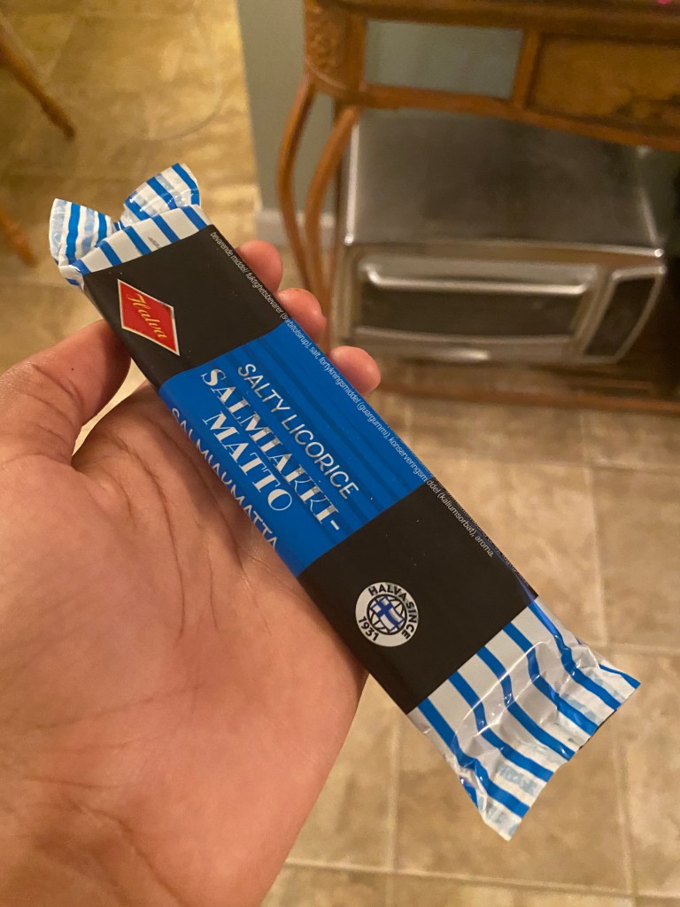 Salmiakki-Matto (Finnish): Okay. Where do I begin? This is… something else. In the booklet, it says that this is salty licorice. This is not good to me at all. I thought the seaweed from the Korean box (a different review) wasn’t good, but this is literally a pain to eat. It’s in my mouth as I write this part, and let me tell you. I’d rather be dared to eat seaweed than to eat this salty licorice. Though in all honesty, I once had an Icelandic Candy called Lakkrís, which contained chocolate and licorice, but actually got better the more you ate. This, on the other hand, is something entirely different. You already know that this gets a “NO” from me. Worst snack I’ve had in the history of eating snacks. 1/5