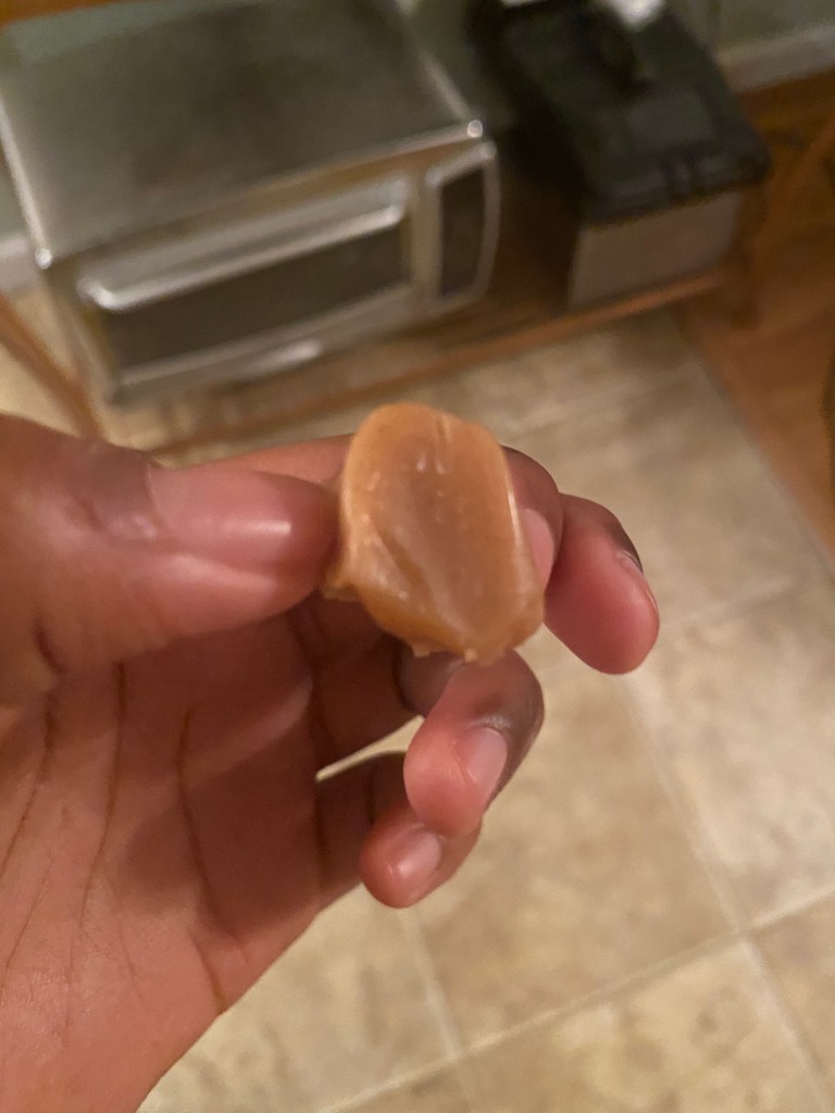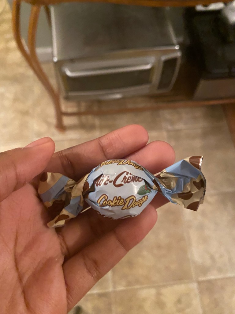 Nöt-Crème (Swedish): Well… that was not like I thought it would be. This is a cookie dough praline. I thought the cookie dough was gonna be solid like from a pack or a tub. It’s a ball, but the dough was gooey, which I wasn’t expecting at all. The concept of cookie dough candy is interesting. It wasn’t bad per se, but I probably would’ve liked it more if the cookie dough was solid. 3.5/5