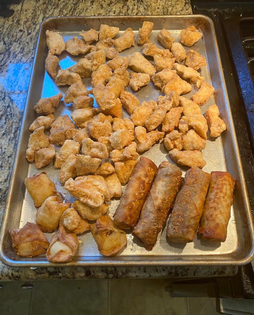 After the chicken was cooked, my mother also fried a few crab rangoons and egg rolls. They made nice finger food on the side and were already made ahead of time. I’ll talk about making the crab rangoons and egg rolls in the future. The photo shows all of those things completed on one pan. Beware that your mouth may water, but that’s alright.