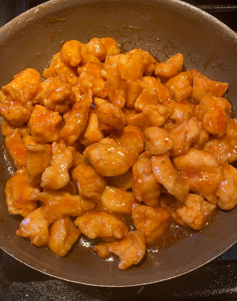 I couldn’t wait to eat after seeing the pan. Though part of the last step was making the sauce for the chicken. She let the sauce simmer for about 15 minutes on a pan, and then she put the cooked chicken into the pan. She made sure to stir the chicken into the sauce and let it sit for a few minutes. After that, the cooking was done! Oh my word, the finished outcome was so good! I love eating homemade Chinese food at home!