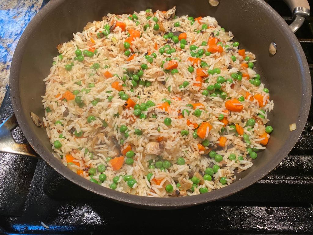 If you read my previous cooking articles, you saw that the white rice is cooked a day ahead of time. Yes, fried rice was made once again. The white rice was cooked in a pan with peas, carrots, onions, and mushrooms later placed into the mix.