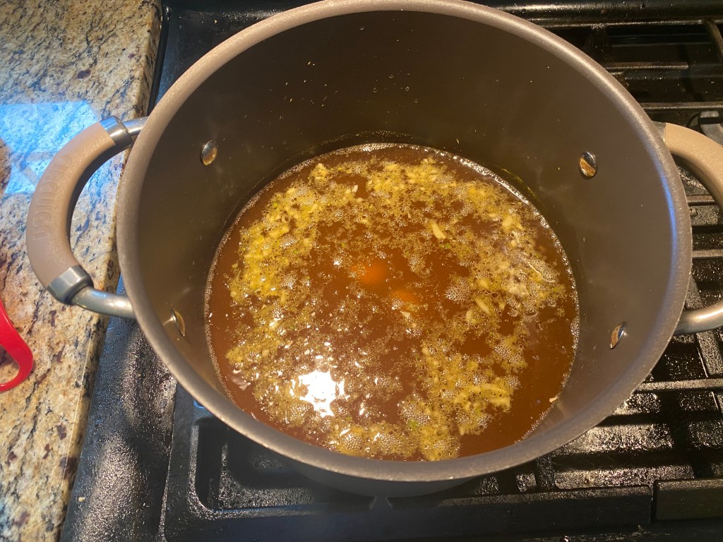 Next thing up was making the broth! Chicken broth, ginger, more soy sauce, and a couple of cloves of garlic were added. From the picture of just those ingredients, it looks like nothing. Of course it’s nothing… until the wontons come into play! Once those wontons were cooked, there was a big difference. Oh my god! Look at that pot!