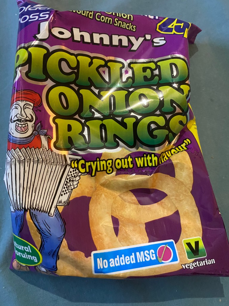 Johnny’s Pickled Onion Rings: Oh lord. The vinegar flavor is STRONG with this one. Reminiscent of the vinegar chips from France, these are supposed to be like something out of a jar. I would probably like these if the flavor wasn’t so strong or if there was some savory spice. The texture is good, but I think the flavor is worse than the French vinegar chips. Too strong so me, so you know it gets a no. 2.25/5