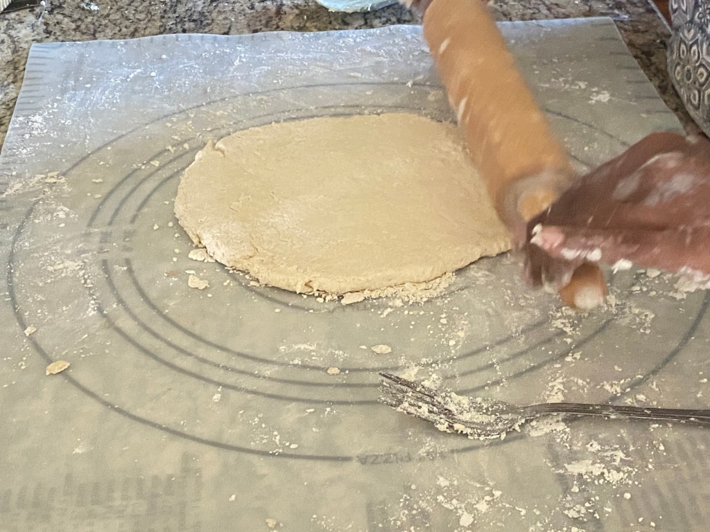 After that comes the giant rolling pin. Okay, not giant, but regular sized rolling pin. Obviously the dough was rolled out, but then comes the circular dough cutter. After cutting out circles the first go-round, my mother continued rolling out the dough until she produced all the circles she could get. If there’s any remaining dough left, she makes it into whatever shape you want. My mother makes what she calls a “hot dog biscuit” with the remaining dough. Although, I prefer to call it a stick biscuit. Though this time, sugar biscuit balls were made with some of the dough. I helped with that, and all I had to do was coat them in brown sugar before placing them in a pan.