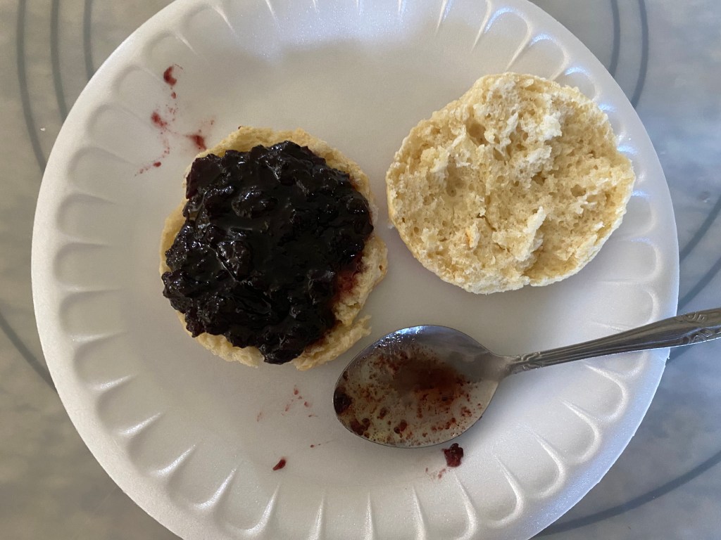 After the cooling stage, it was time to dig in! I ate a plain biscuit, while my mother used blueberry preserves that she calls “Smurfberry jam.” Of course the biscuits can be eaten plain, with honey, preserves, marmalade, butter, jam— the list goes on.