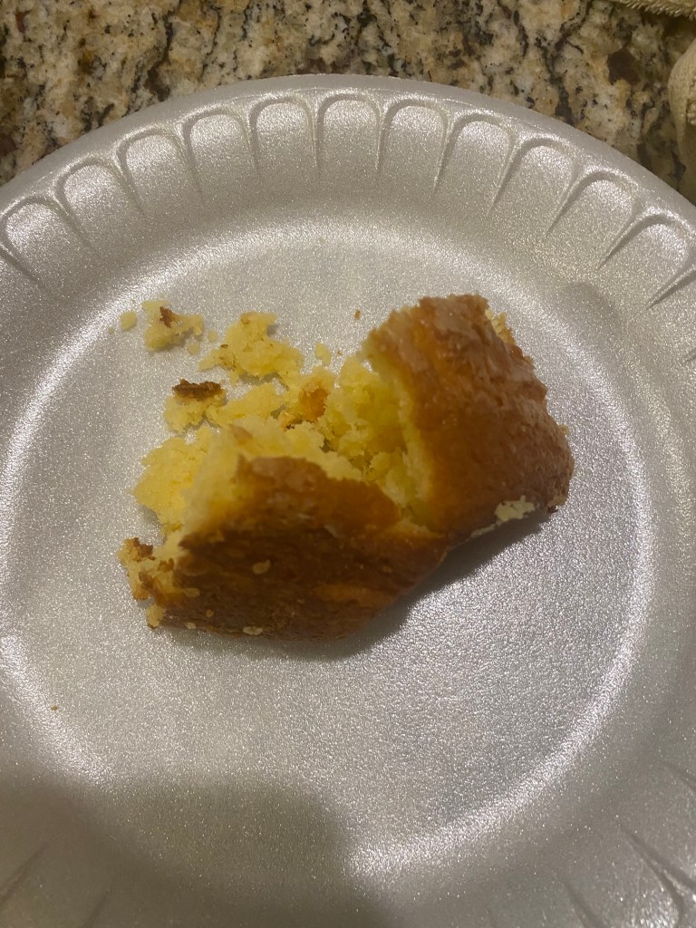 When all that was said and done, the cake looked SO GOOD! It looked like my mother made it! I used a dowel to make sure the middle part wasn’t wet. But when it came to cutting a slice, how did I not know to remove the cake from the pan? My slice turned out broken due to not doing that beforehand, but the taste was better than the look. The lemon flavor was present, but because I used Duncan Hines cake mix, it had a lighter texture. I prefer cakes with a heavier texture, so Betty Crocker cake mix would’ve been better. Don’t get me wrong. The flavor was good, but the heaviness would’ve made it a slam dunk.