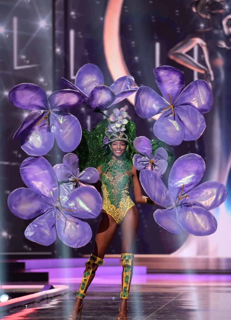 This costume tributes Jamaica’s national flower, the Lignum Vitae. I thought the purple flowers surrounding her body were cute. They enamored me at first sight. I also like how the body suit was a simple yellow and green color scheme. Those colors popped out without being an overkill and while complimenting the purple flowers. Overall, a nicely-executed costume!