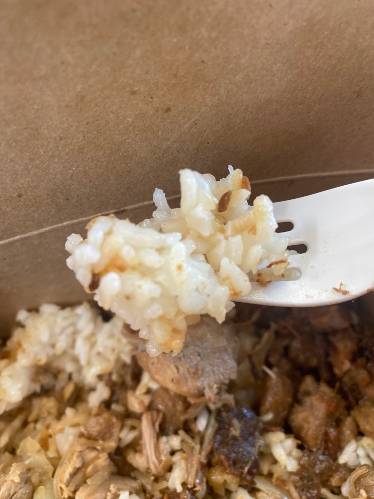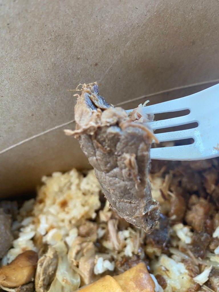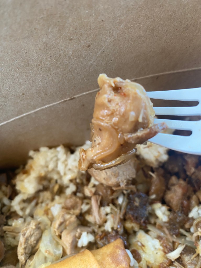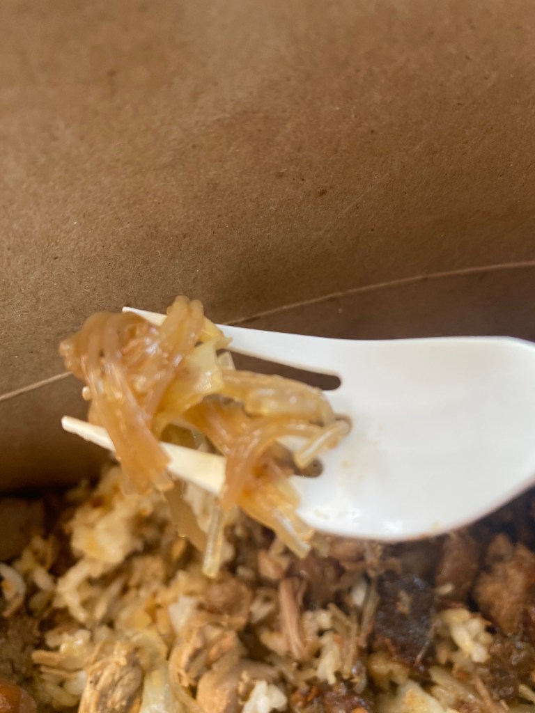 I also tried the veggie pancit, the base from my mother’s box. It tasted fine. Definitely a passable base, but my base was the garlic rice. The garlic flavor lingered, but the rice was drier than I envisioned. Granted, sticky rice is meant to be paired with a flavorful entrée, especially umami-flavored ones. Am I right?