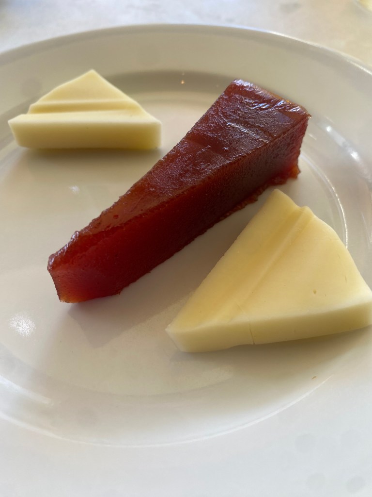 And make no mistake—I still had to eat one last course to close out my meal. No way was I going to pass on that. The third and final dish was a dessert called Romeu e Julieta, which consists of cheese and goiabada (guava paste). The slice of cheese is meant to be eaten with goiabada, and the goiabada at first glance reminded me of a thicker, firmer version of cranberry sauce.